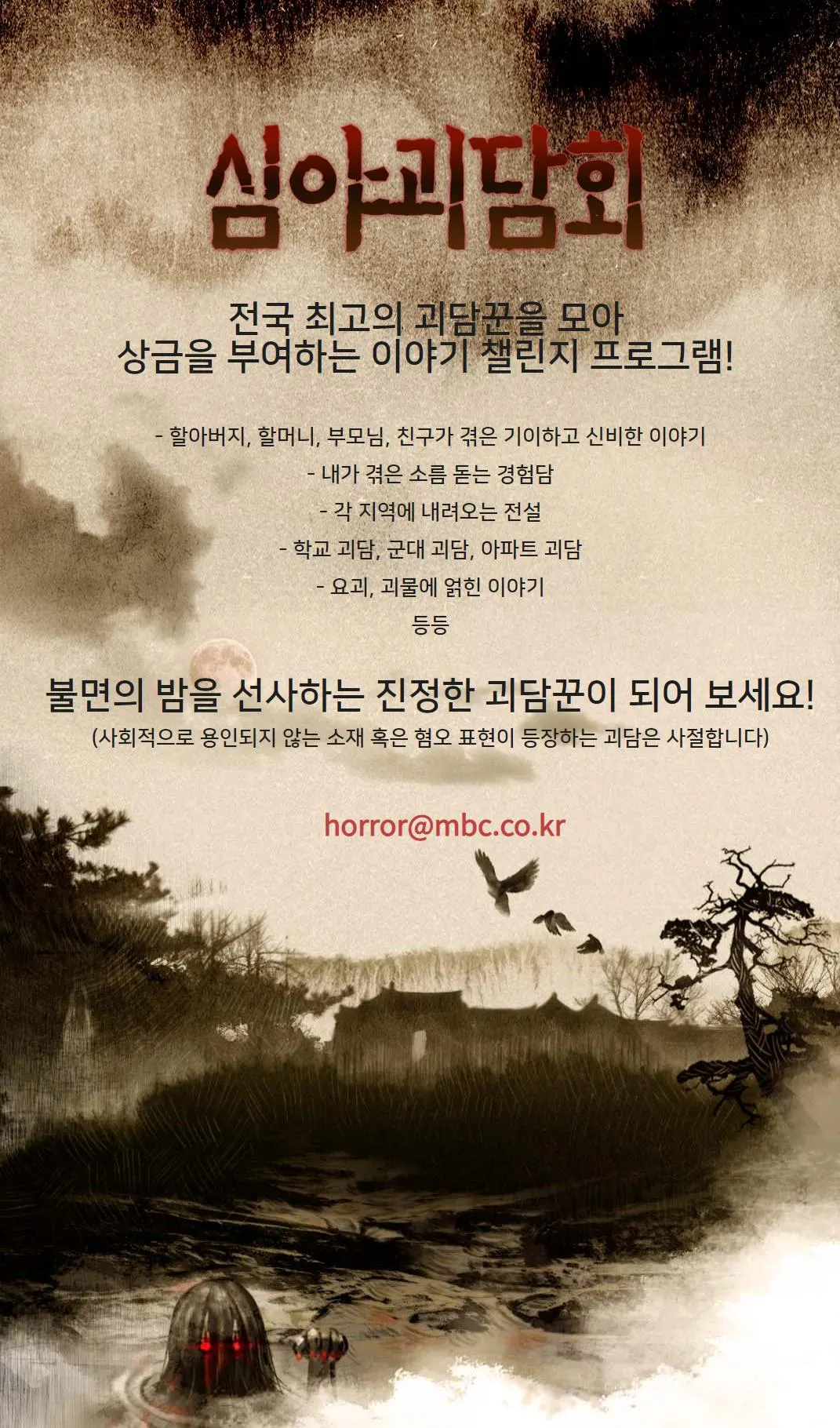 거의 병실에 있었습니다. 침대에 누워 여러 가지 콘텐츠를 봤죠. 오랜만에 복습한 HBO 명작 드라마 <트루 디텍티브>도 새삼 너무 좋았고(매튜 맥커너히의 러스트 콜에게 쥐어지는 합격 목걸이), 리뷰 목적으로 읽어본 류연웅 작가의 안전가옥 작품들도 감탄이 나올 정도로 재미있었고(여러분, 앞으로의 연웅 작가님 작품 기대 많이 해주세요! 진짜로!), VOD로 풀려서 볼 수 있었던 이준익 감독의 영화 <자산어보>도 황홀했어요. 좋은 이야기는 언제나 인생의 원동력이 되어주기에, 1분기도 돌아보면 많은 스토리 콘텐츠들이 제 멱살을 잡고 ‘인간다운 삶’을 향해 질질 끌고 가 주었네요. 그 모든 콘텐츠들에게 감사의 말을 전합니다. 그중에서 이번 월간 안전가옥에 소개할만한 인상적인 1분기 콘텐츠는 뭐가 있을까 고민한 끝에 제 픽은... ...다름 아닌 MBC 예능 <심야괴담회>입니다!
