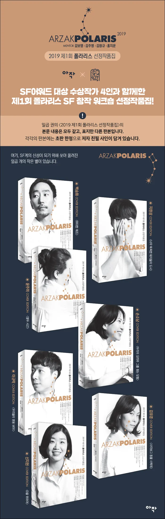 SF 전문 출판사 아작과 안전가옥이 함께 준비한 [2019 아작 x 안전가옥 폴라리스 워크샵]은 한국형 클라리온 워크샵을 지향하는 창작 워크샵으로 기획되었습니다. SF어워드 대상 수상작가 4인(김창규, 김보영, 김주영, dcdc)이 소설 창작의 길잡이가 되고, 멘티 작가는 8주간의 온라인 멘토링과 오프라인 합평을 통해 한 편의 단편소설을 완성하였습니다.