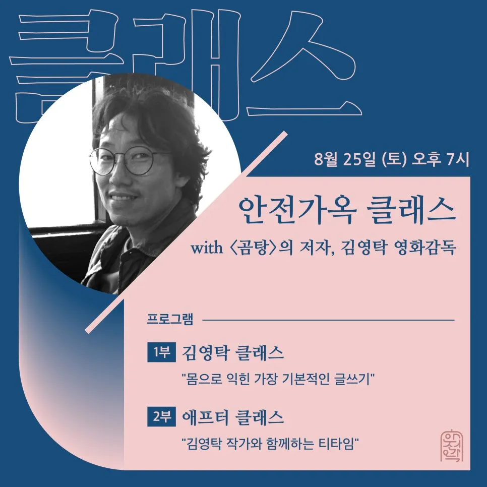 영화 <헬로우 고스트>, <슬로우 비디오>부터 소설 <곰탕>까지. 직접 쓴 시나리오로 영화를 연출하고 소설, 드라마를 넘나들며 이야기를 만들어 온 김영탁 작가의 강연을 진행했습니다. 곧이어 2부 애프터 클래스에서는 김영탁 작가와 차를 마시면서 더 진득한 대화를 나눠보았습니다.