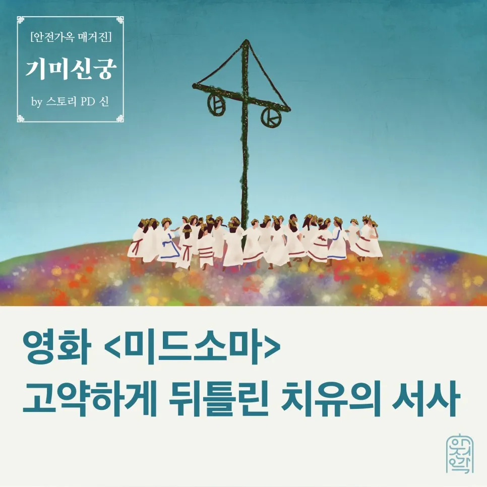 평범하게 살아가고 싶지만 과거의 상처로 인해 고통스러운 삶을 살아가던 주인공이 어떠한 사건을 겪고 그 상처를 치유한다. ‘치유의 서사'를 간단하게 요약하면 이렇죠. <미드소마> 역시 위의 문장처럼 요약할 수 있어요. 문제는 ‘어떠한 사건'이 바로 ‘9일간의 끔찍한 축제'라는 것이죠. 이상하잖아요. 보통 이런 사건을 겪으면 트라우마가 치유되는 것이 아니라 생기는 게 정상이죠. 기괴한 의식들을 행하고, 눈앞에서 사람들이 죽어나가는 축제를 보고 트라우마가 치유된다고요?