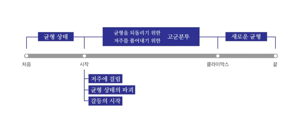 주인공은 욕망을 가지고 반드시 행동해야 하는 저주에 걸리게 됩니다. 이 순간을 이야기의 [시작]이라고 불렀어요. 이야기가 [시작]하기 위한 필수적이면서도 최소한의 정보를 제공하는 단계가 [처음]이고요.