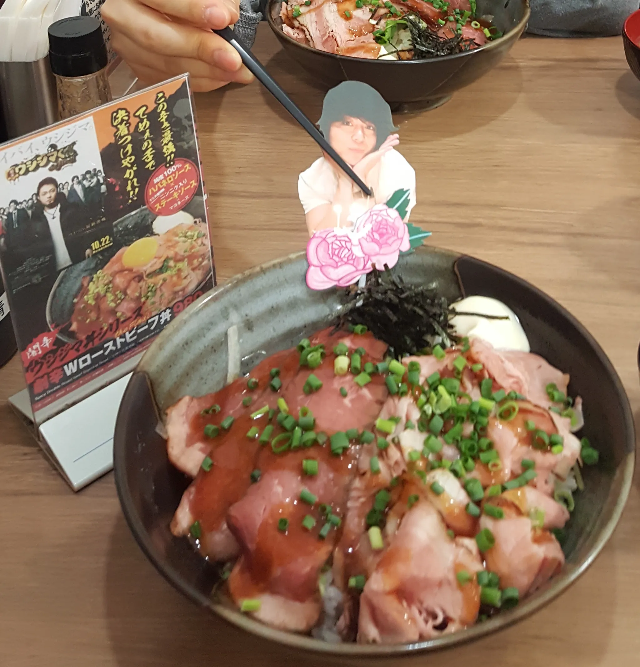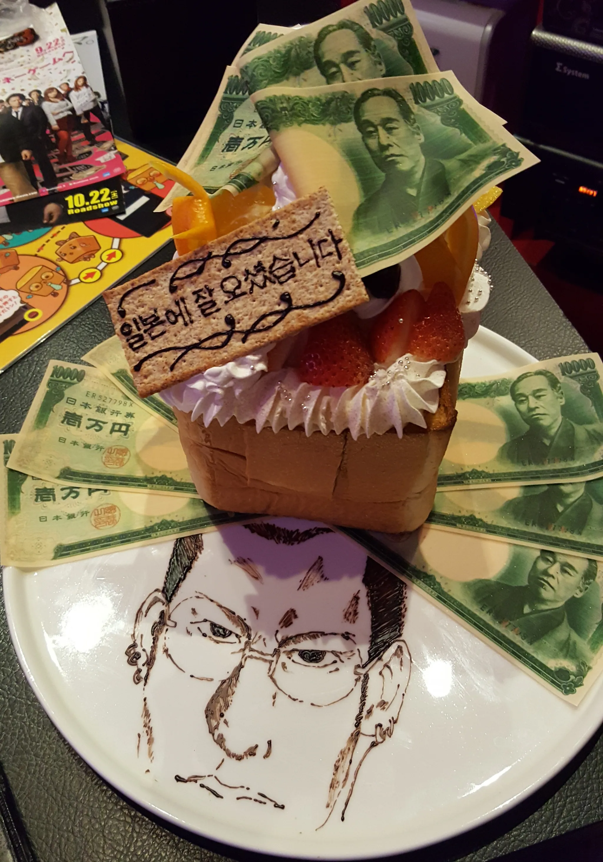 만화 <사채꾼 우시지마>의 영화 개봉을 기념하며 생겼던 콜라보 가게들이었습니다. 사진은 그날 가서 먹었던 ‘우시지마 덮밥’인데요(...). 작품의 주인공인 우시지마가 점심 때만 되면 정말 맛있게 먹던 덮밥이에요. 입안에서 사르르 녹는 고기를 행복하게 해치우고, 가라오케에 갔더니 그곳에서는 '한국에서 온 우시지마 팬'이라는 희귀성(?)으로 저를 특별 대접 해주셨죠. (아래 사진은 사채꾼 우시지마 컨셉으로 만들어주신 허니 브레드... 흉악하네요^^)